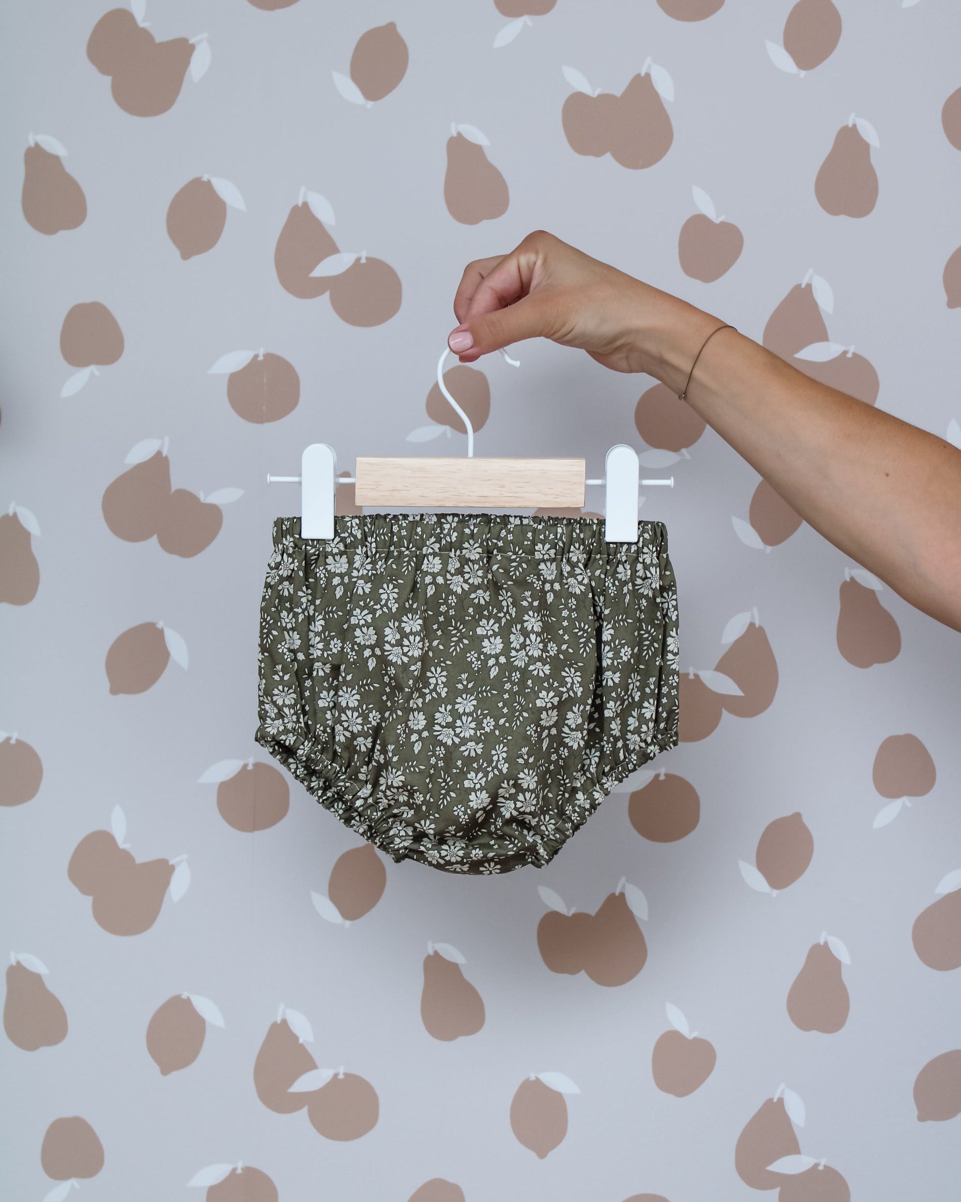Bloomer en Liberty Tana Lawn couleur kaki, en 100% coton. Avec ou sans collants, c'est un intemporel adorable pour nos petites poupées.