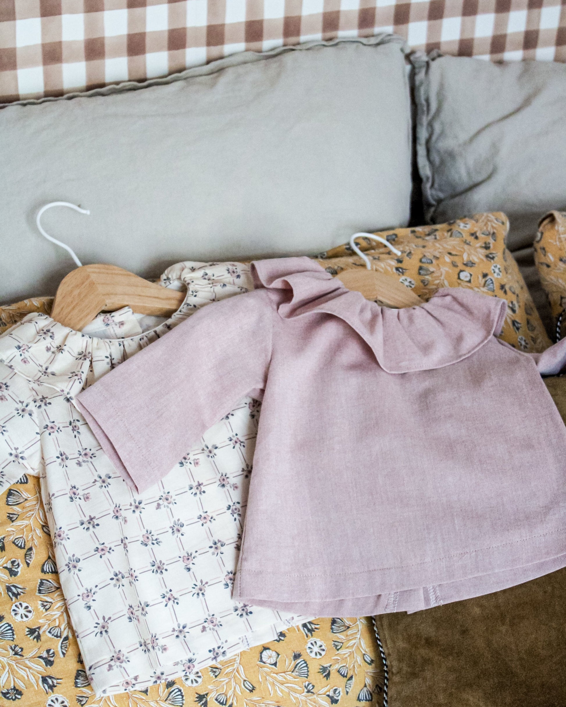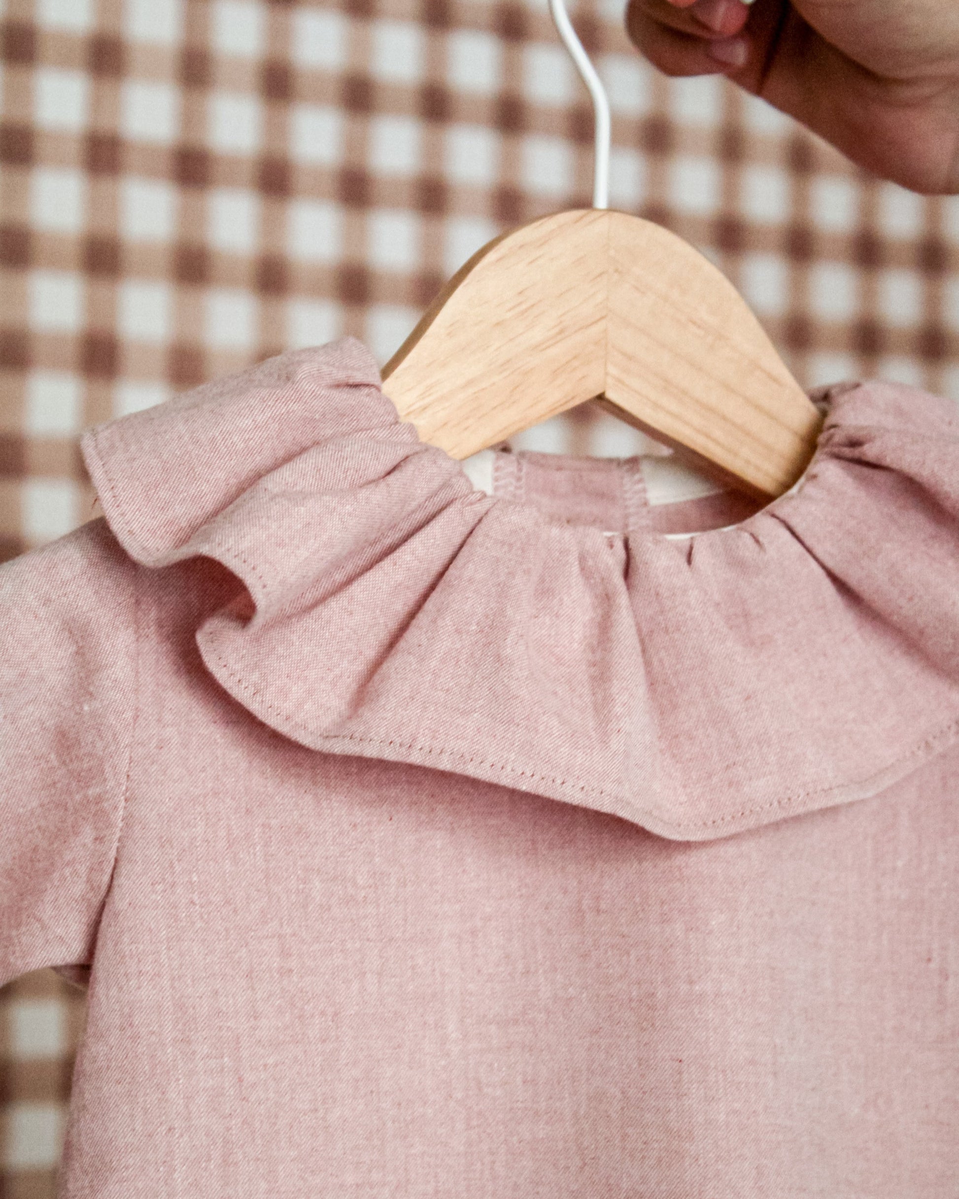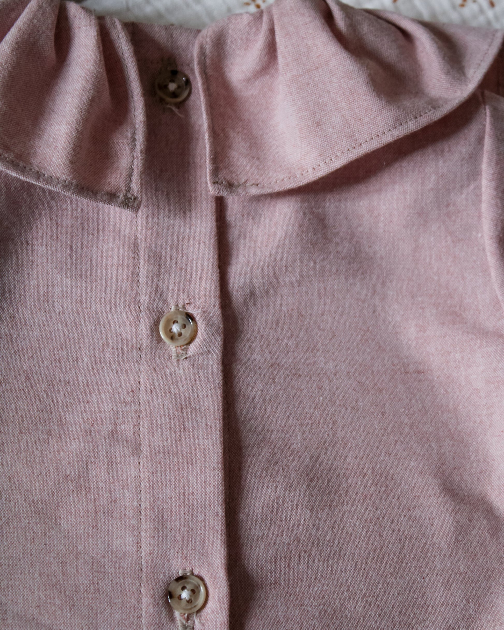 La blouse Thaïs est confectionnée en tissu couleur rose boudoir 100% coton. C'est un intemporel aux jolis détails : un grand col volanté et des boutons couleur écaille dans le dos.