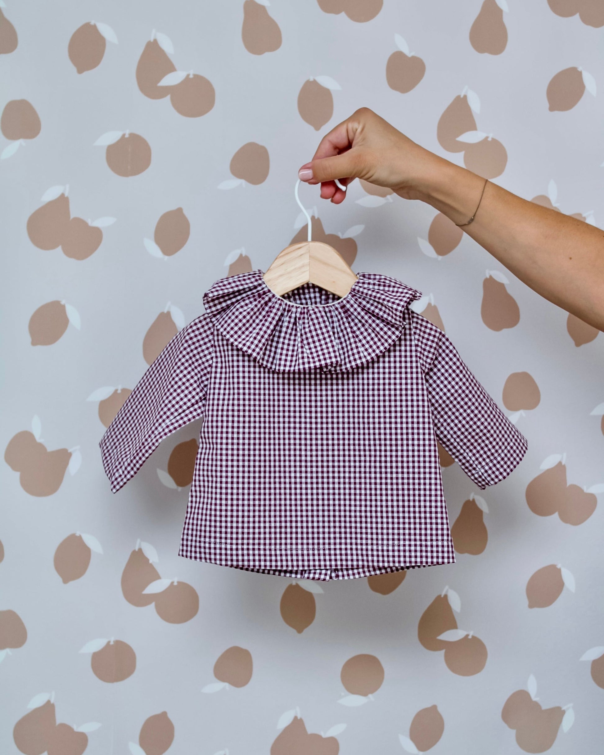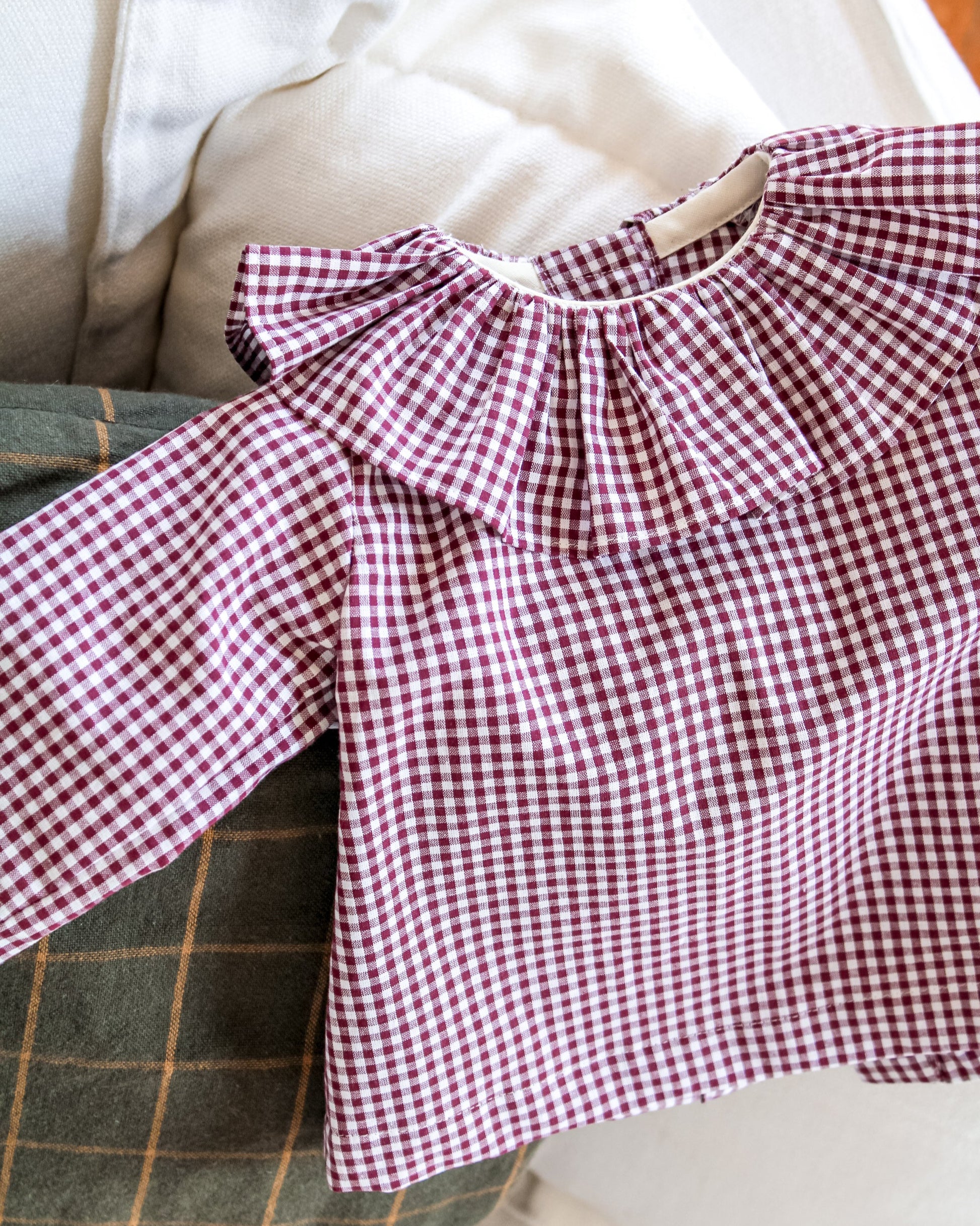 La blouse Faustine est confectionnée en tissu 100% coton très doux. Véritable classique dans le vestiaire des petites filles, cette blouse à col volanté se distingue par ce vichy couleur lie de vin, parfait pour la saison automne/hiver. Elle se ferme dans le dos avec des boutons marron glacé.
