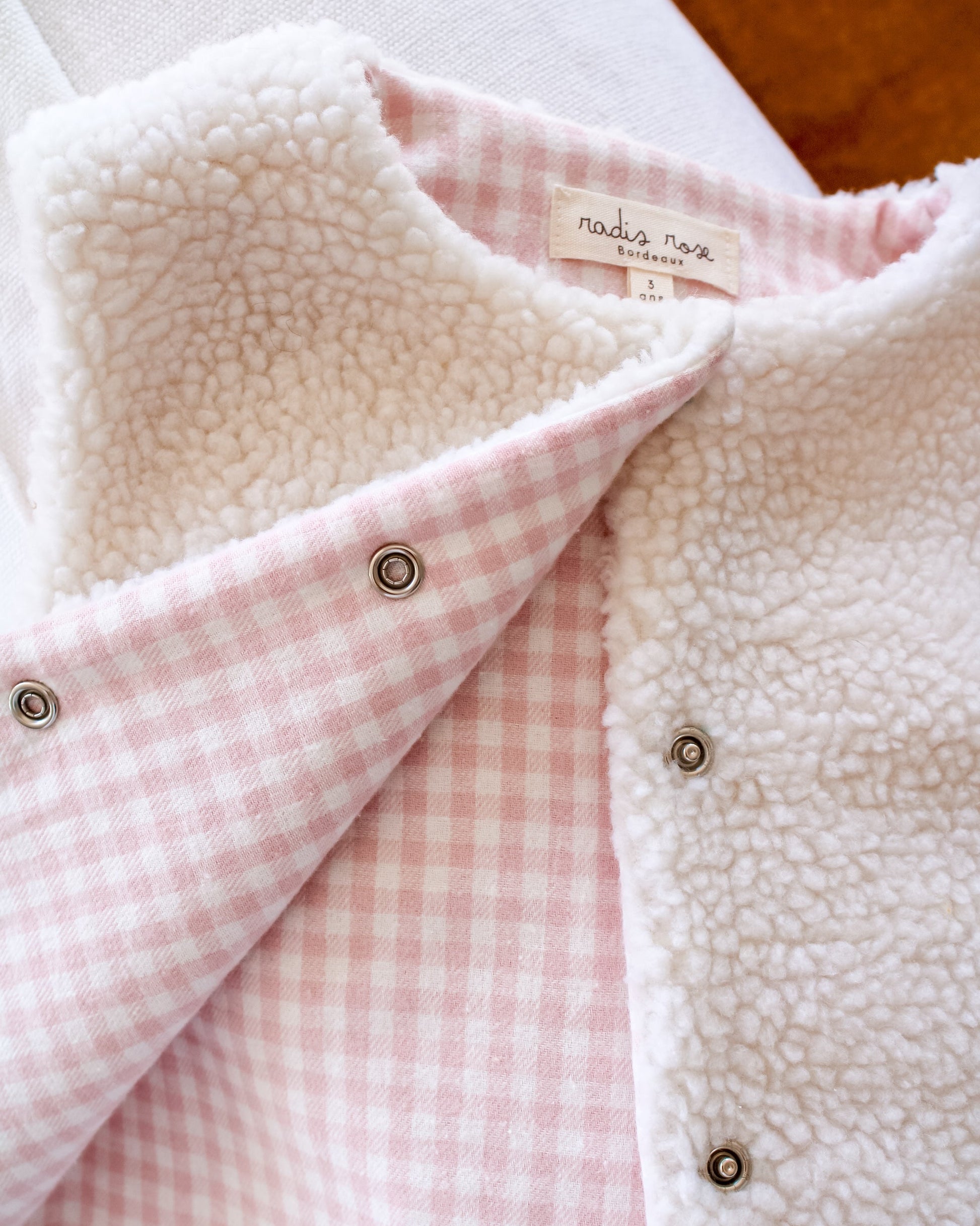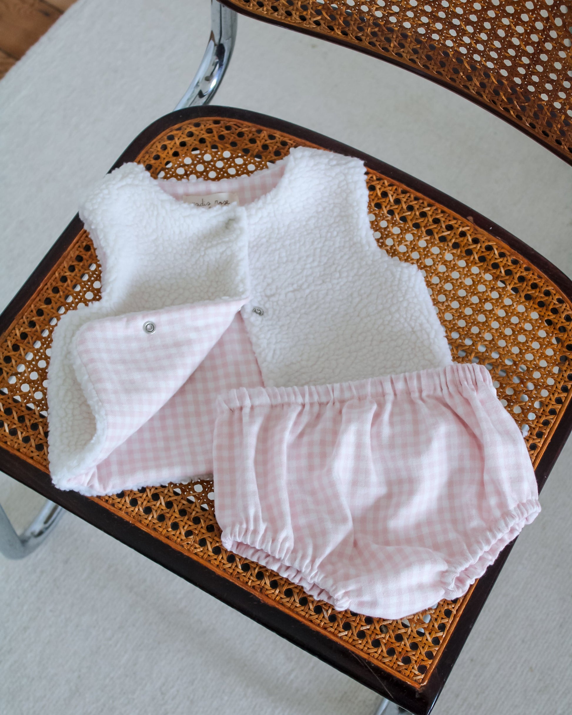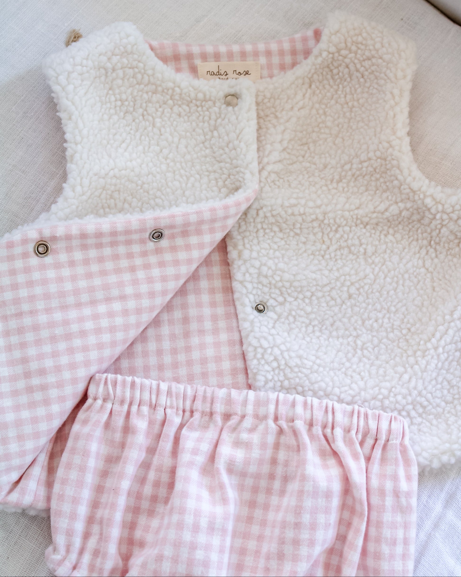 Cet ensemble Pia se compose d'un gilet sherpa et d'un bloomer assorti en flanelle 100% coton vichy rose.