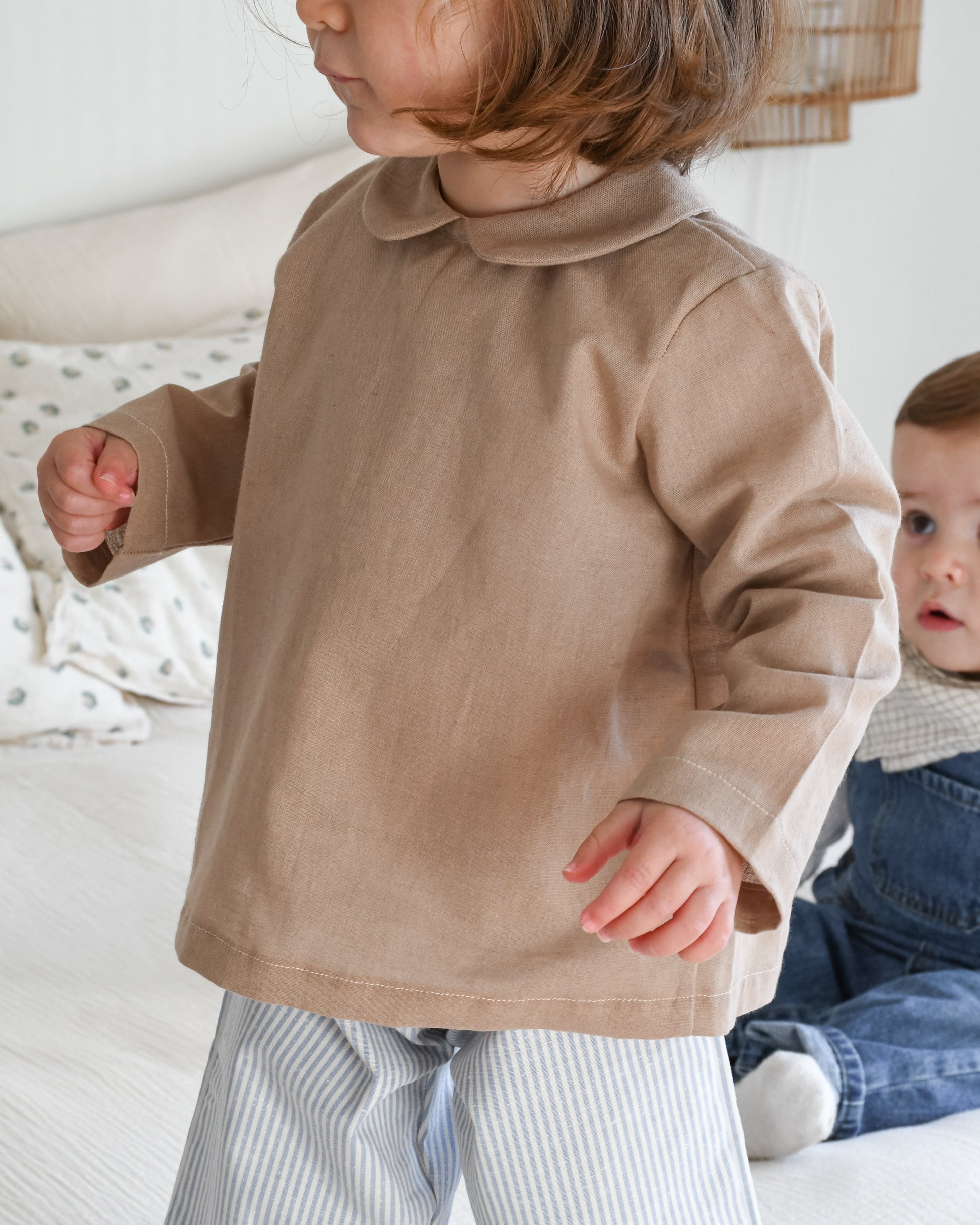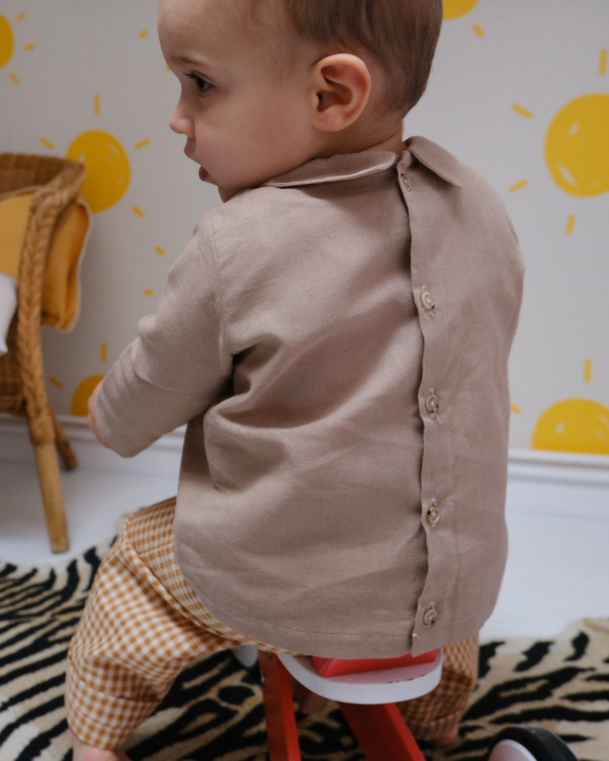La guimpe Charlotte est cousue dans un très beau coton indien camel, tout droit venu de Singapour.